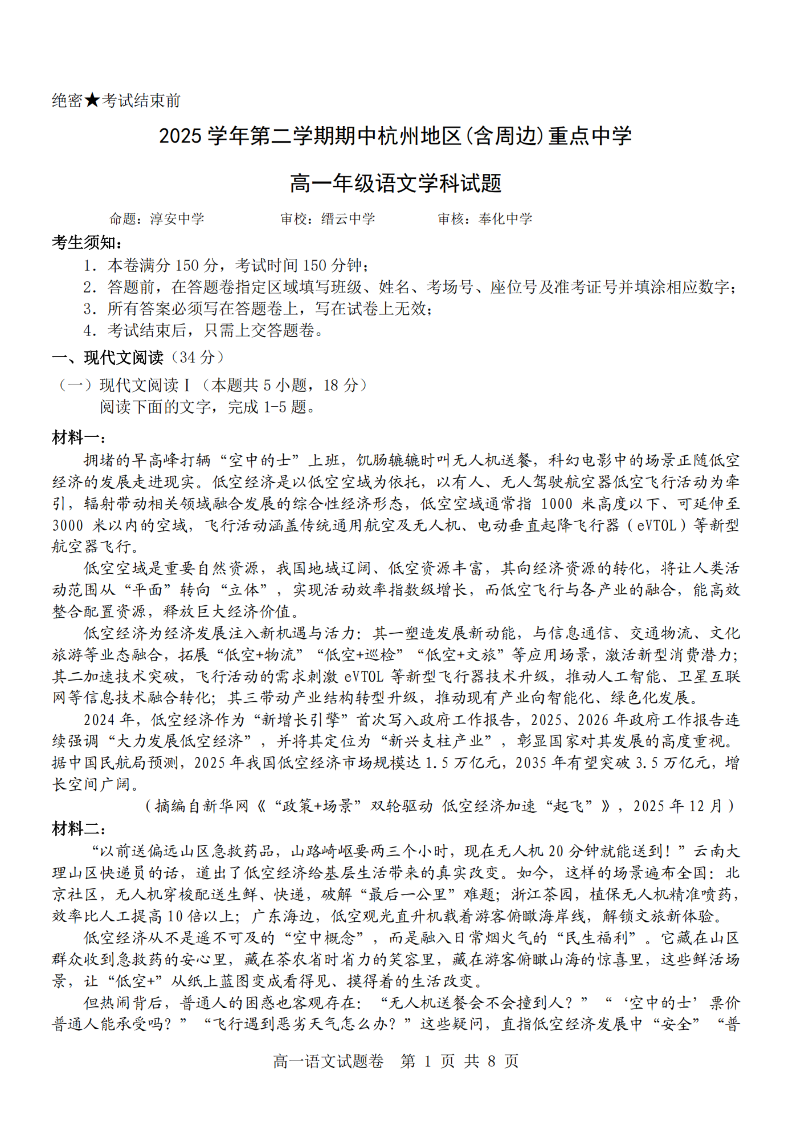 杭州地区(含周边)重点中学2025学年高一第二学期期中联考 语文.pdf