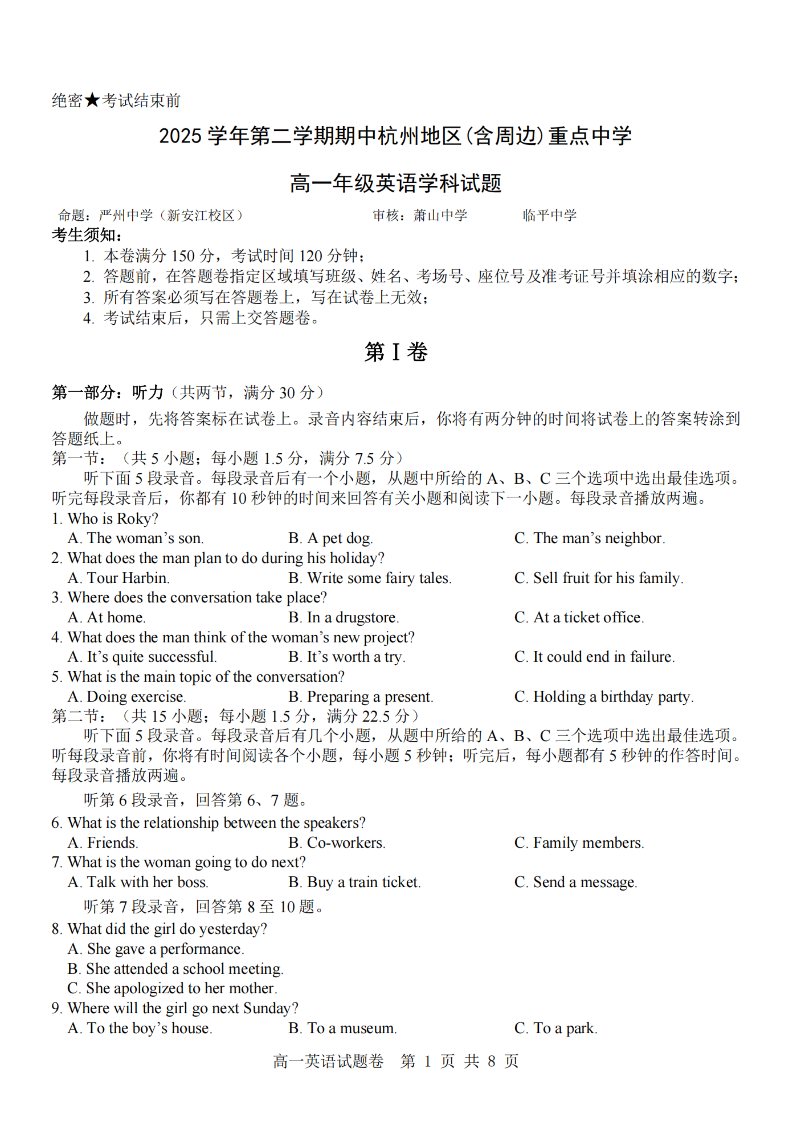 杭州地区(含周边)重点中学2025学年高一第二学期期中联考 英语.pdf