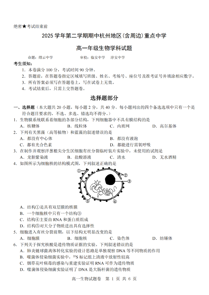 杭州地区(含周边)重点中学2025学年高一第二学期期中联考 生物.pdf