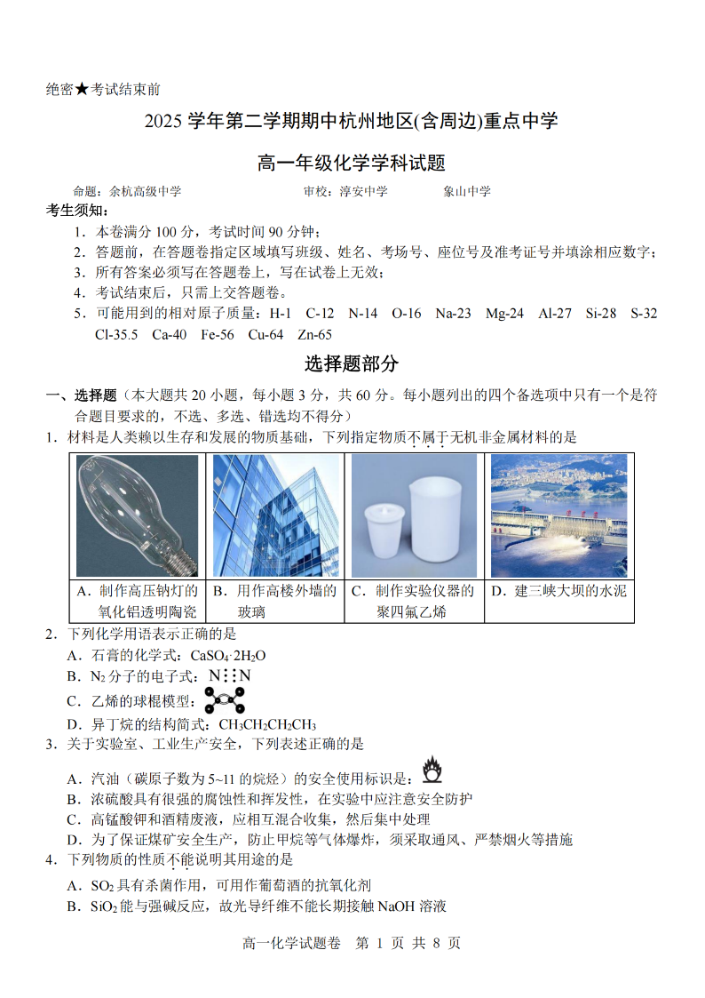 杭州地区(含周边)重点中学2025学年高一第二学期期中联考 化学.pdf