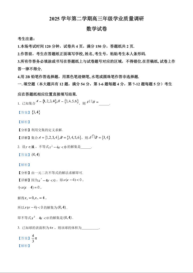 上海闵行区2025-2026学年高三下学期学业质量调研(二模)数学答案.docx