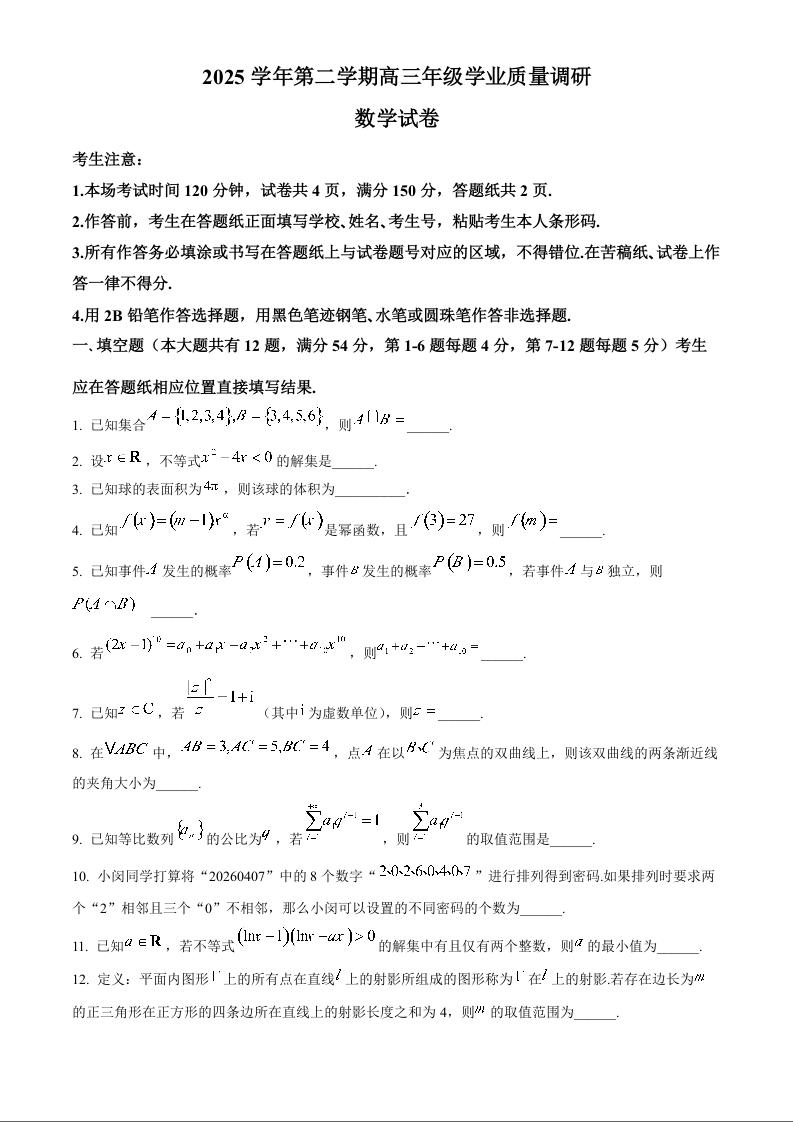 上海闵行区2025-2026学年高三下学期学业质量调研(二模)数学.docx