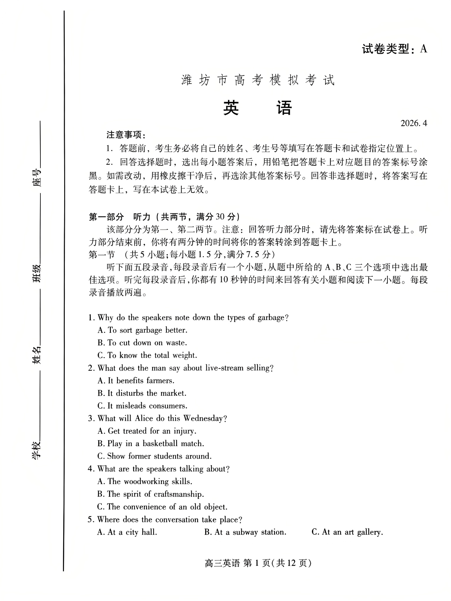 潍坊巿2026年4月高考模拟考试 英语.pdf