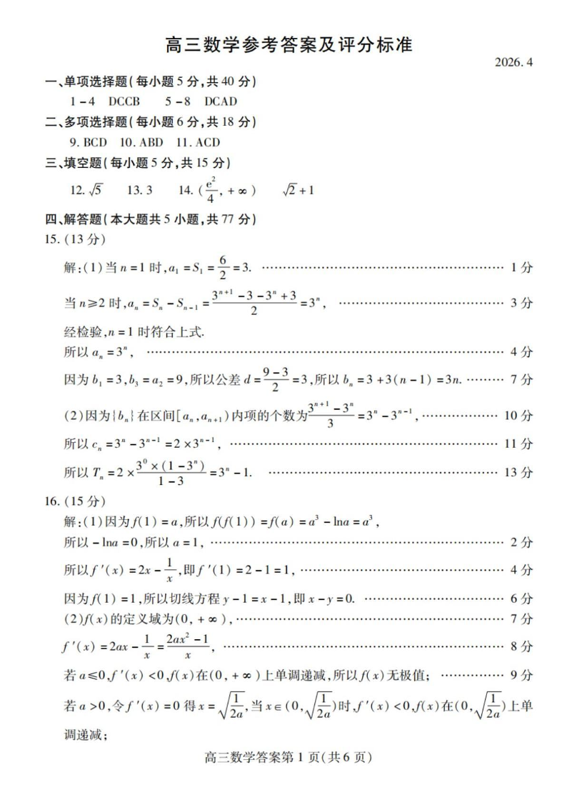 潍坊巿2026年4月高考模拟考试 数学答案.pdf