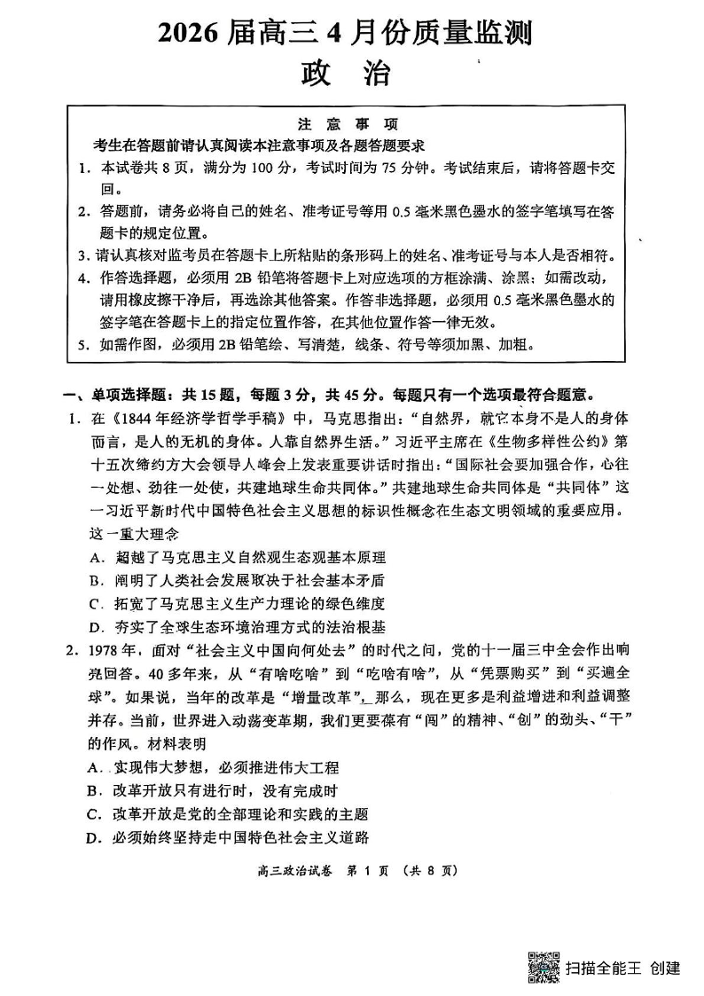 江苏省南通市、徐州市基地学校大联考2026届高三4月份质量监测 政治试题(含答案).pdf