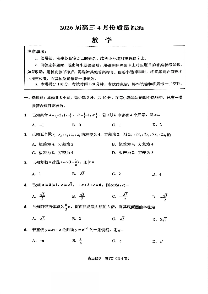 江苏省南通市、徐州市基地学校大联考2026届高三4月份质量监测 数学试题(含答案).pdf