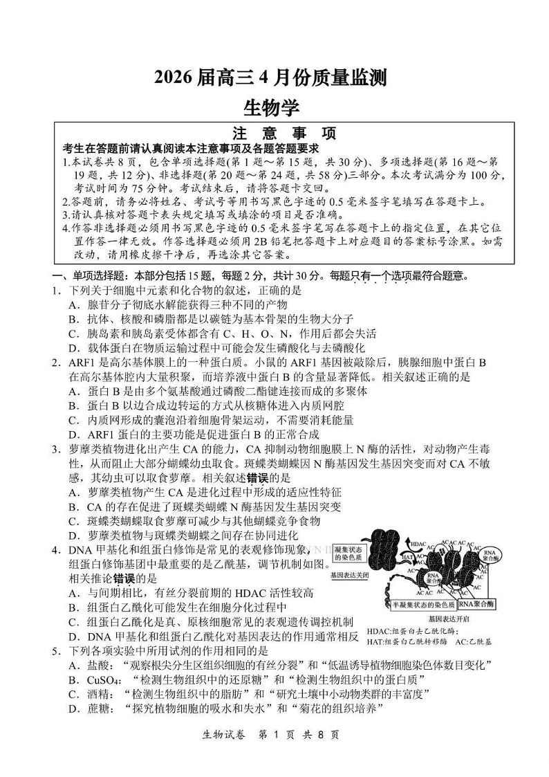 江苏省南通市、徐州市基地学校大联考2026届高三4月份质量监测 生物试题(含答案).pdf