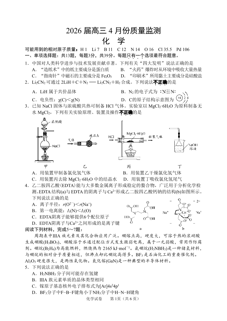 江苏省南通市、徐州市基地学校大联考2026届高三4月份质量监测 化学试题(含答案).pdf