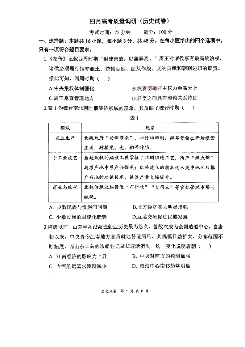 辽宁省协作校2026届高三四月高考质量调研 历史.pdf