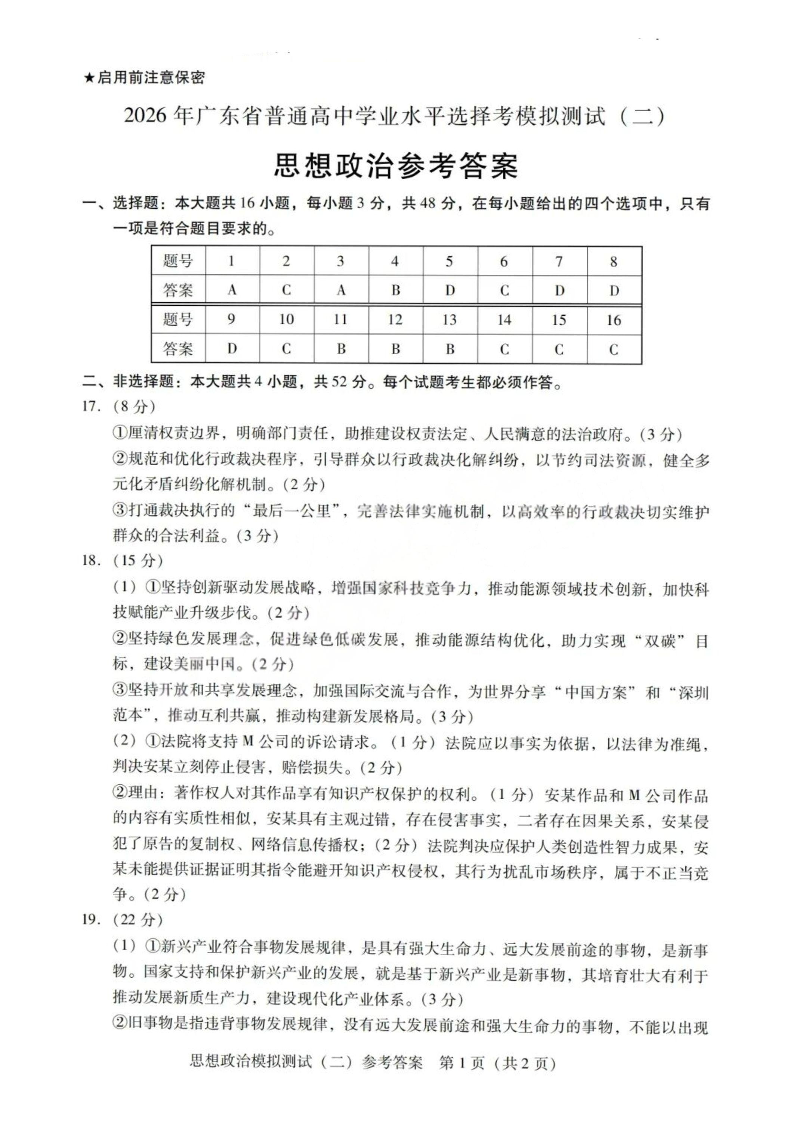 2026年普通高中学业水平选择考模拟测试(二)政治答案.pdf