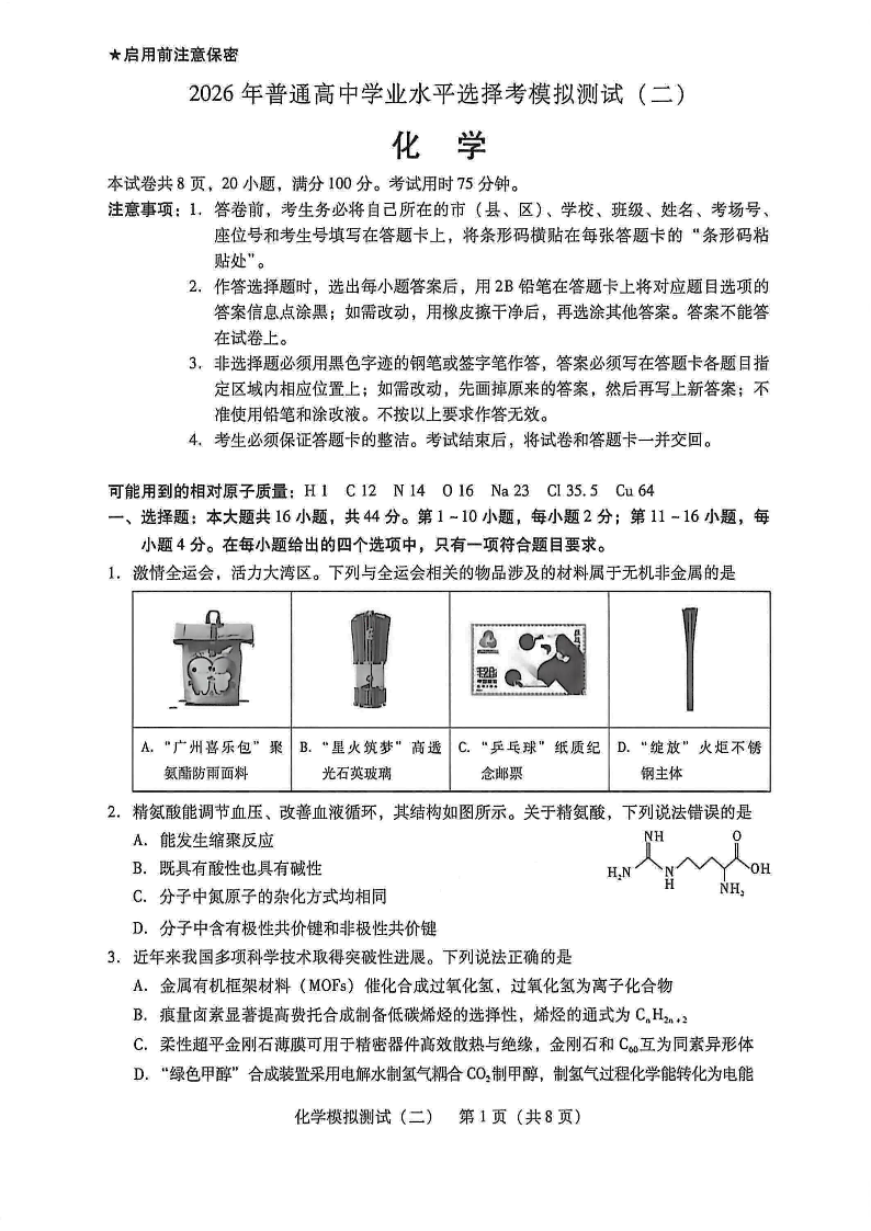 2026年普通高中学业水平选择考模拟测试(二)化学.pdf