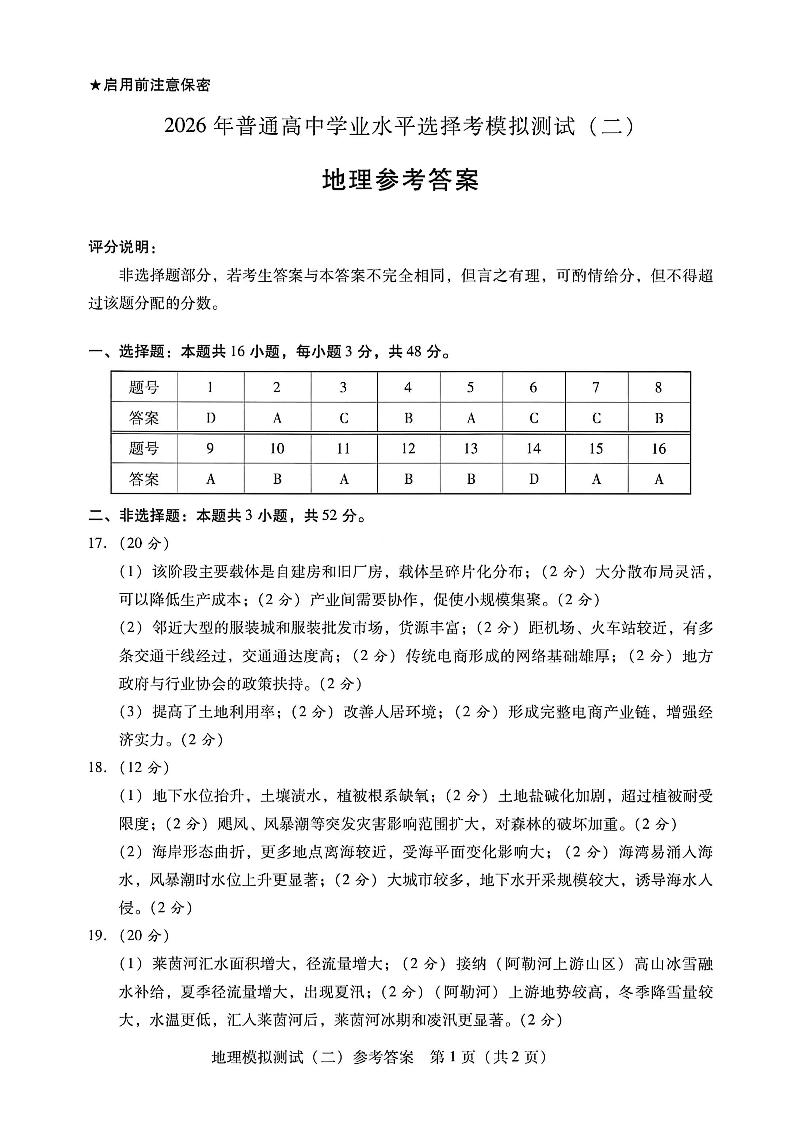 2026年普通高中学业水平选择考模拟测试(二)地理答案.pdf