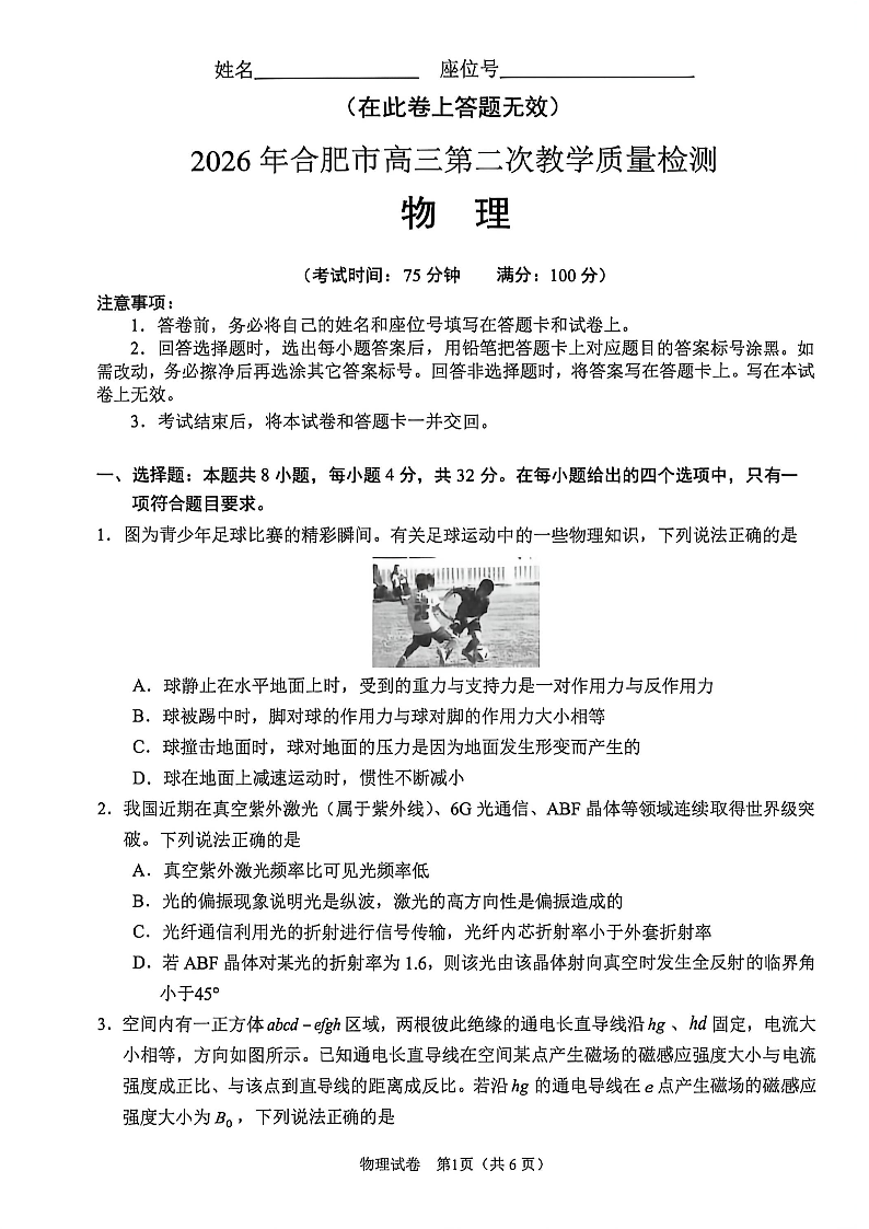 2026年合肥市高三第二次教学质量检测 物理.pdf