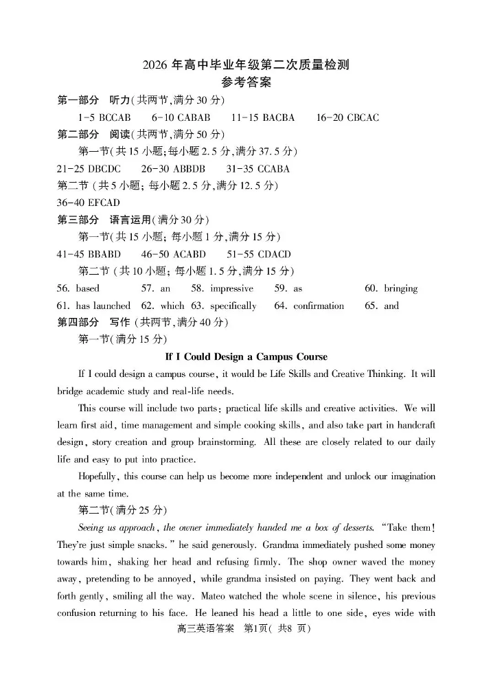 2026年高中毕业年级第二次质量检测 英语答案.pdf