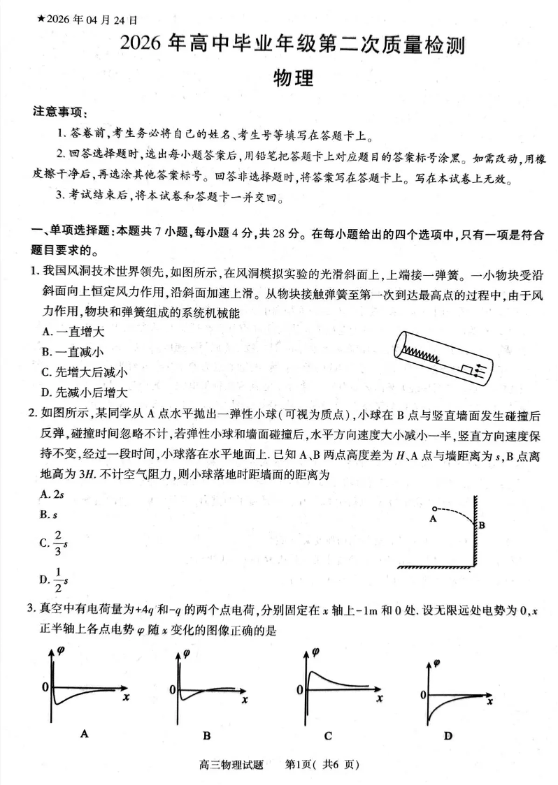 2026年高中毕业年级第二次质量检测 物理.pdf