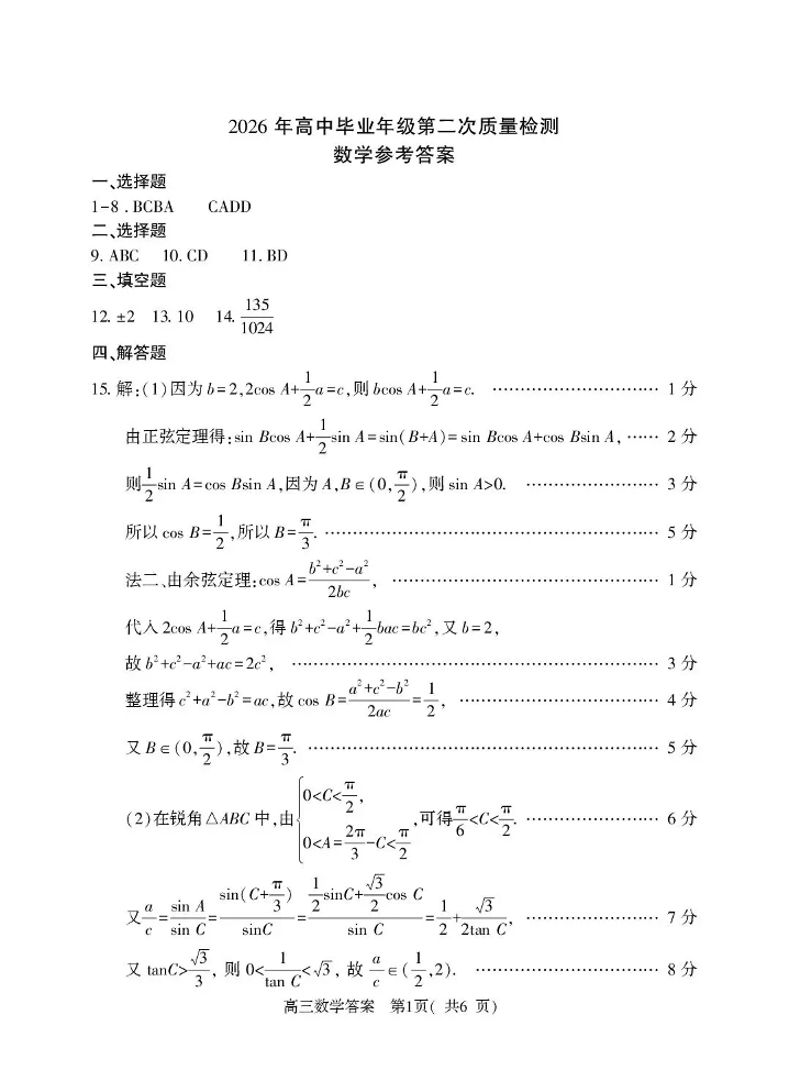 2026年高中毕业年级第二次质量检测 数学答案.pdf