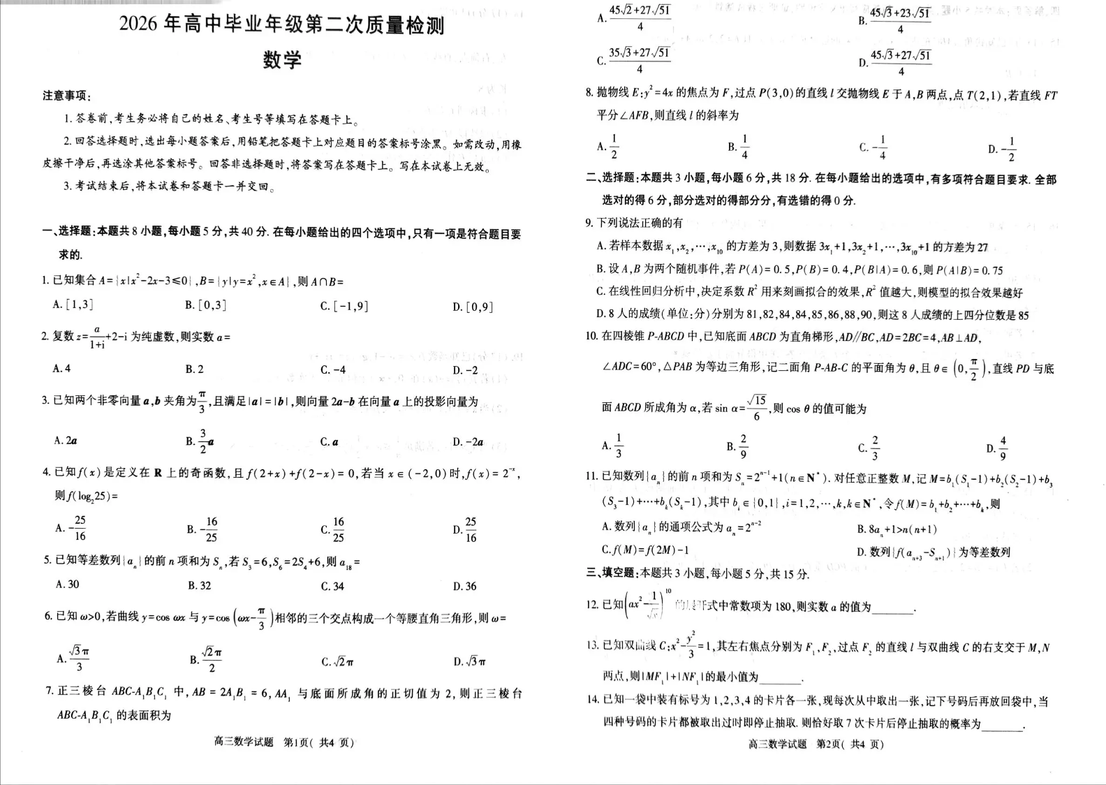 2026年高中毕业年级第二次质量检测 数学.pdf