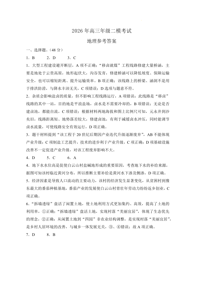 2026年高中毕业年级第二次质量检测 地理答案.pdf
