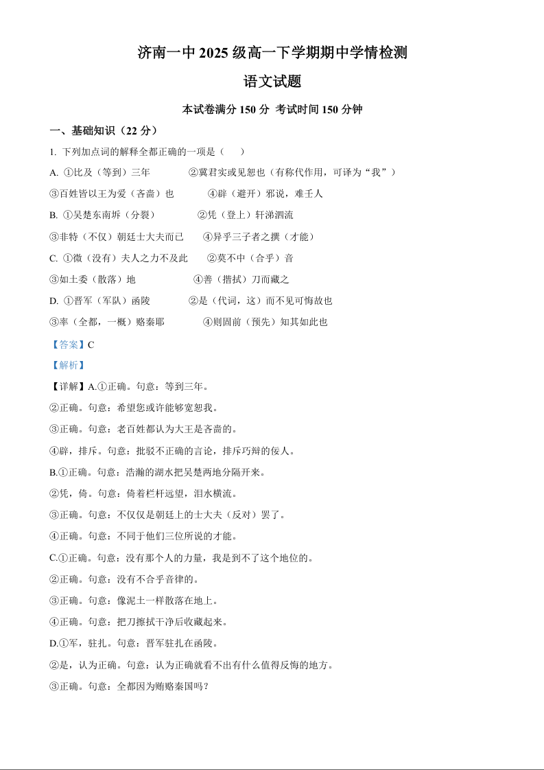 山东省济南第一中学2025-2026学年高一下学期期中学情检测 语文答案.docx
