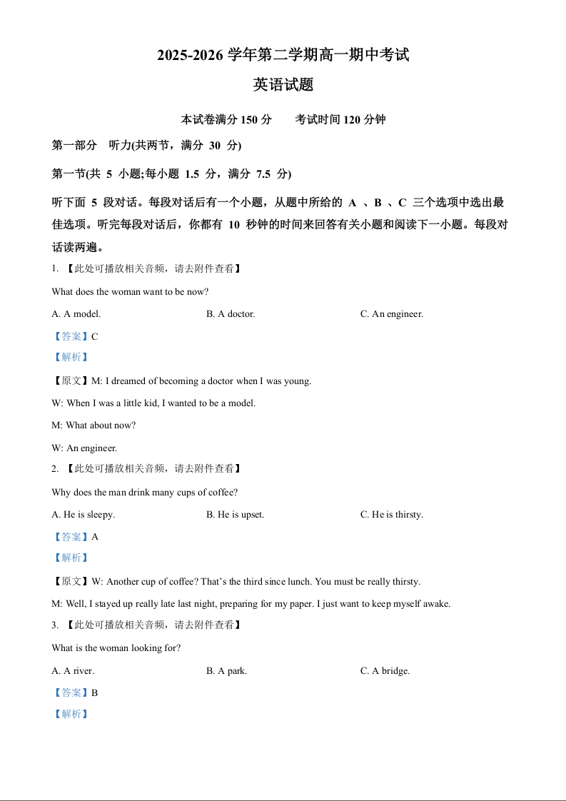 山东省济南第一中学2025-2026学年高一下学期期中学情检测 英语答案.docx