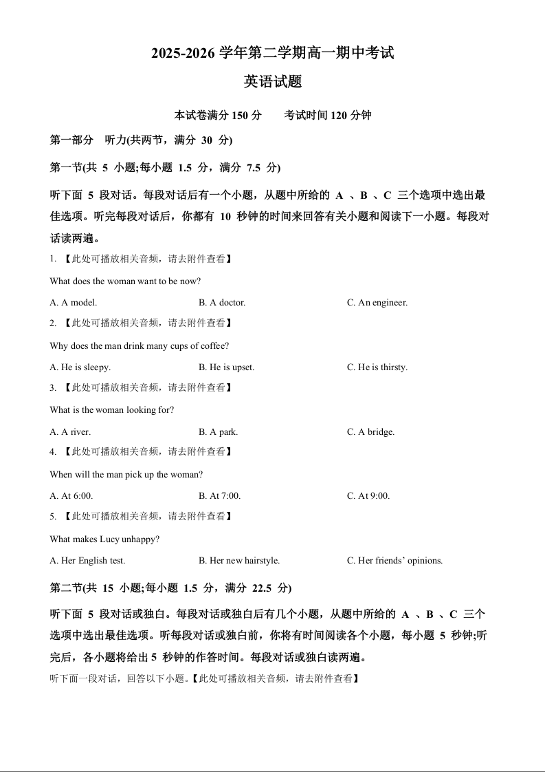 山东省济南第一中学2025-2026学年高一下学期期中学情检测 英语.docx