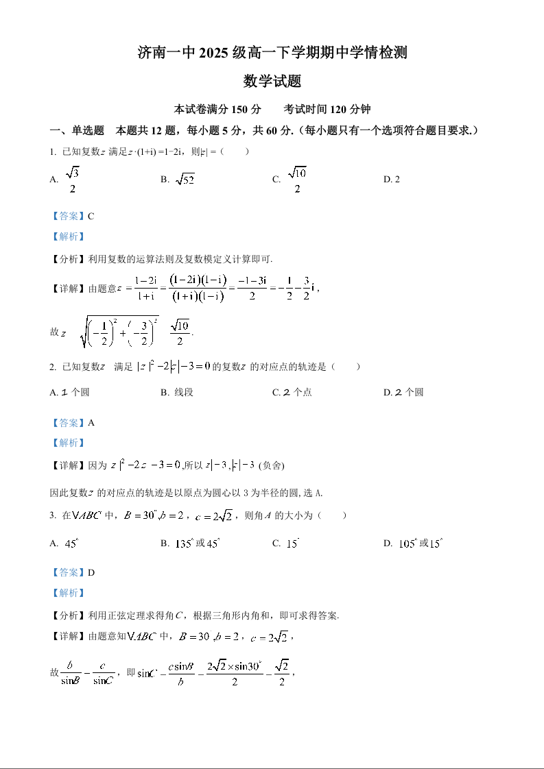 山东省济南第一中学2025-2026学年高一下学期期中学情检测 数学答案.docx