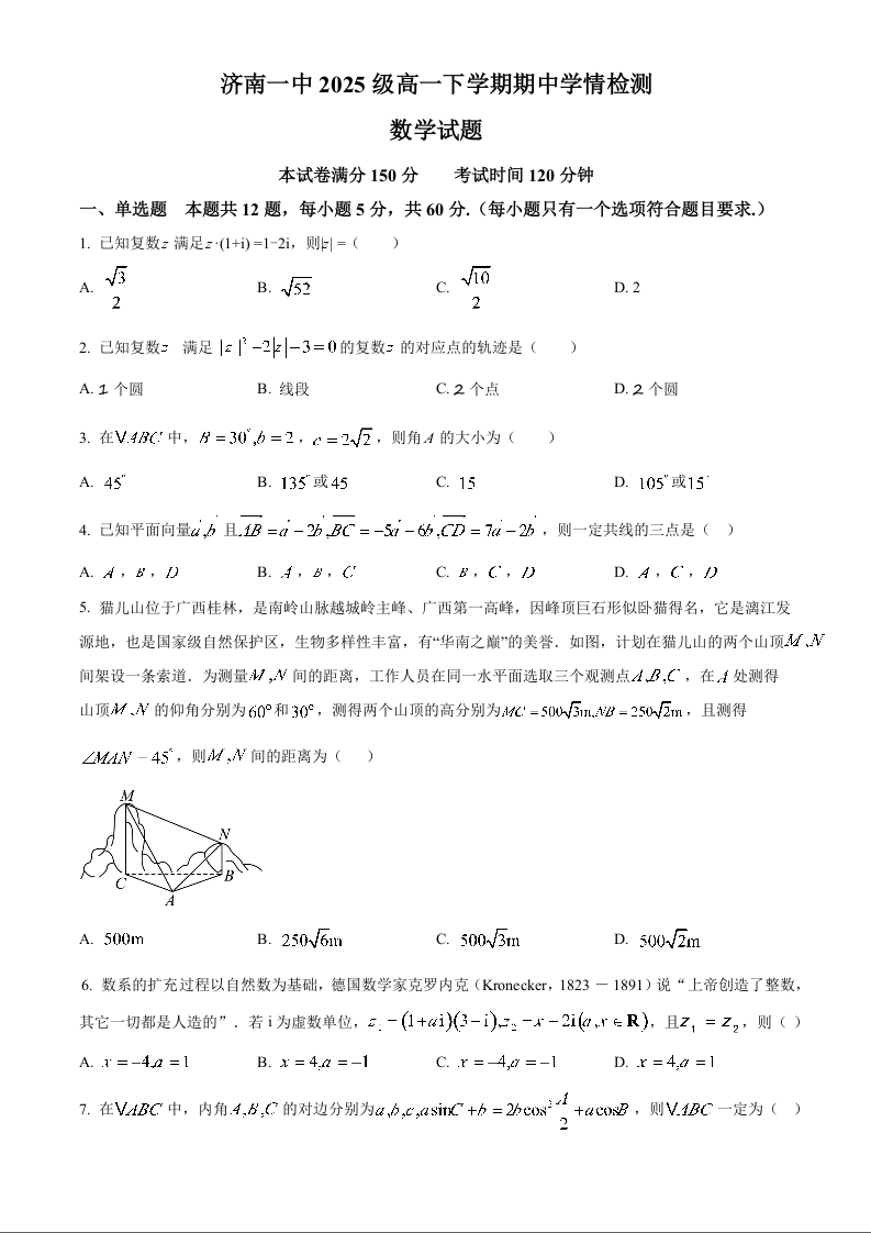 山东省济南第一中学2025-2026学年高一下学期期中学情检测 数学.docx