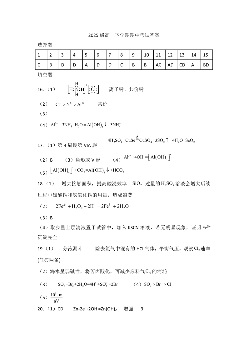 山东省济南第一中学2025-2026学年高一下学期期中学情检测 化学答案.pdf