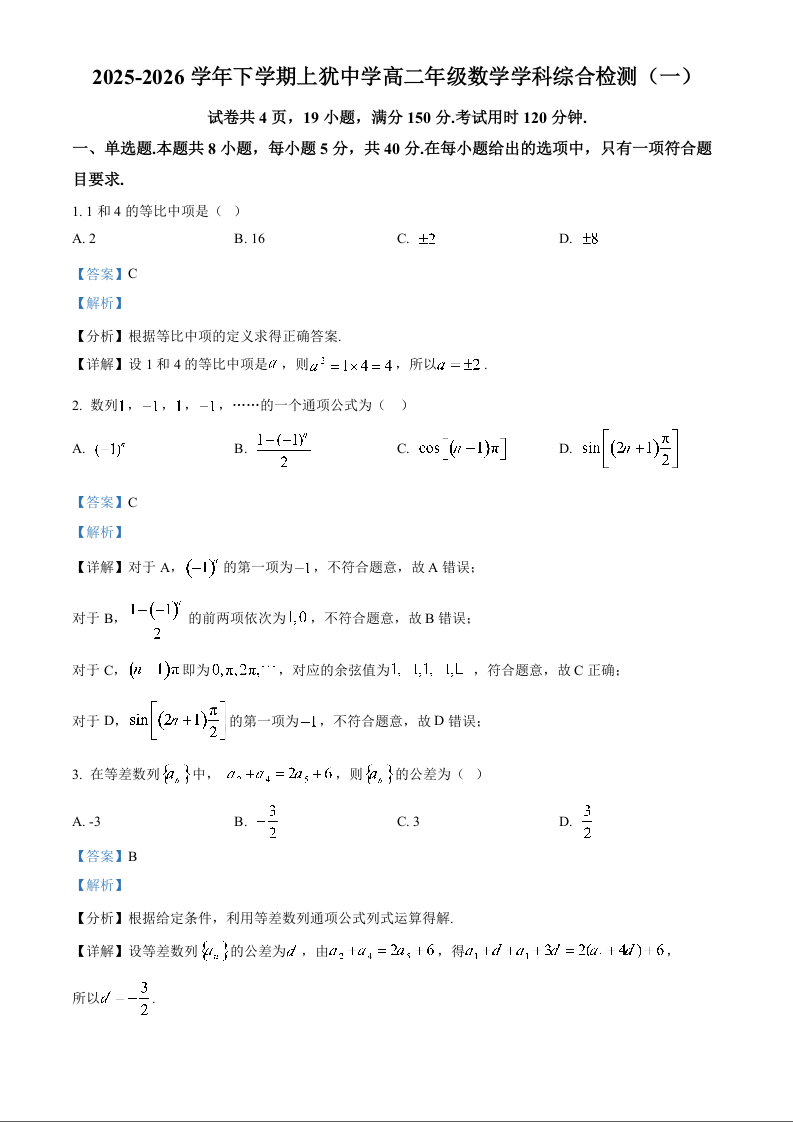 江西省赣州市四校2025-2026学年高二下学期综合检测联考(一)数学答案.docx
