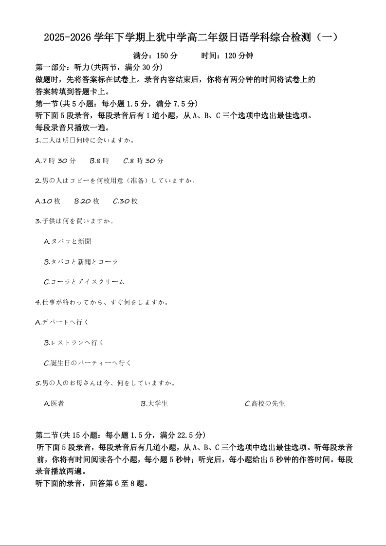 江西省赣州市四校2025-2026学年高二下学期综合检测联考(一)日语答案.docx