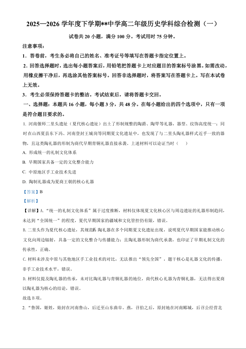 江西省赣州市四校2025-2026学年高二下学期综合检测联考(一)历史答案.docx