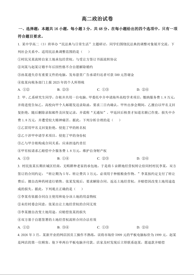 湖北省武汉市洪山高级中学2025-2026学年高二下学期期中考试 政治.docx