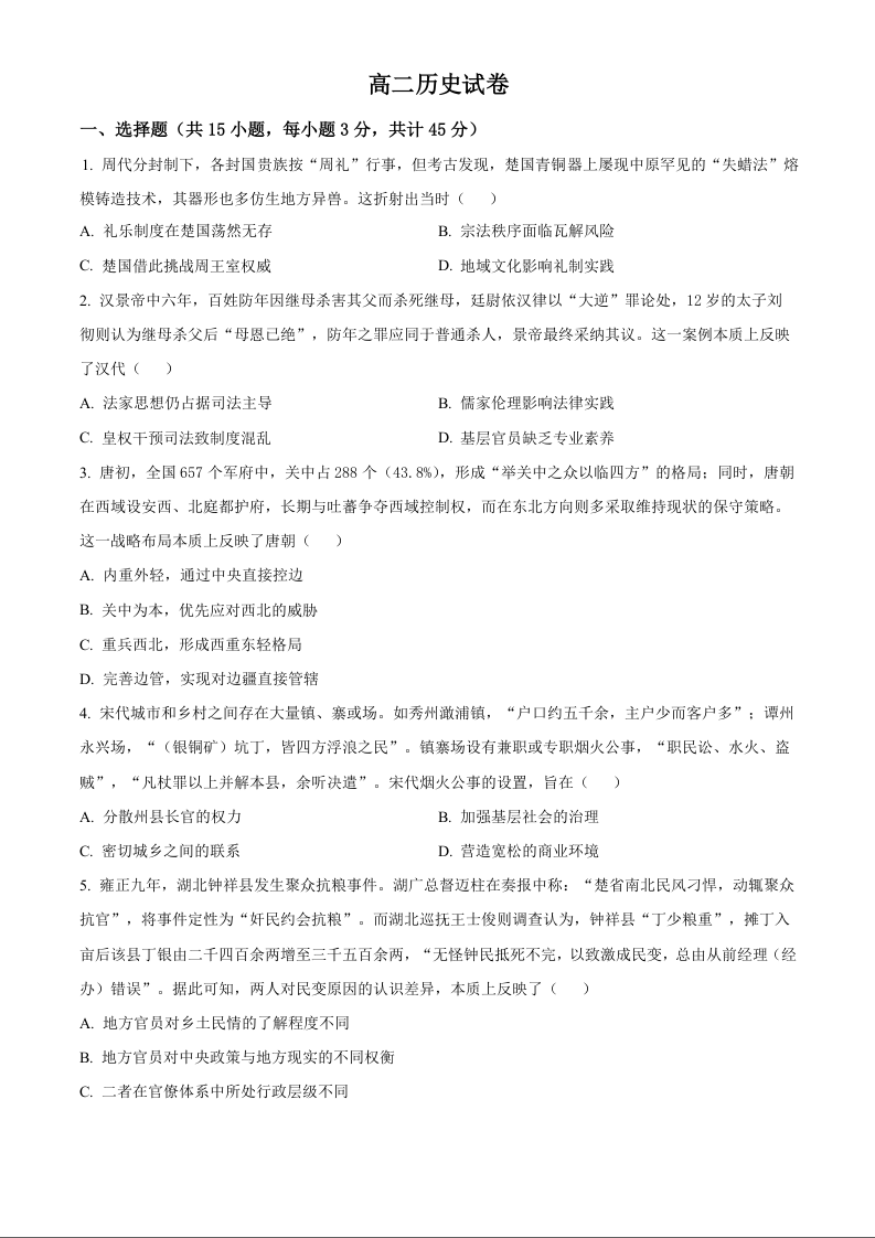 湖北省武汉市洪山高级中学2025-2026学年高二下学期期中考试 历史.docx