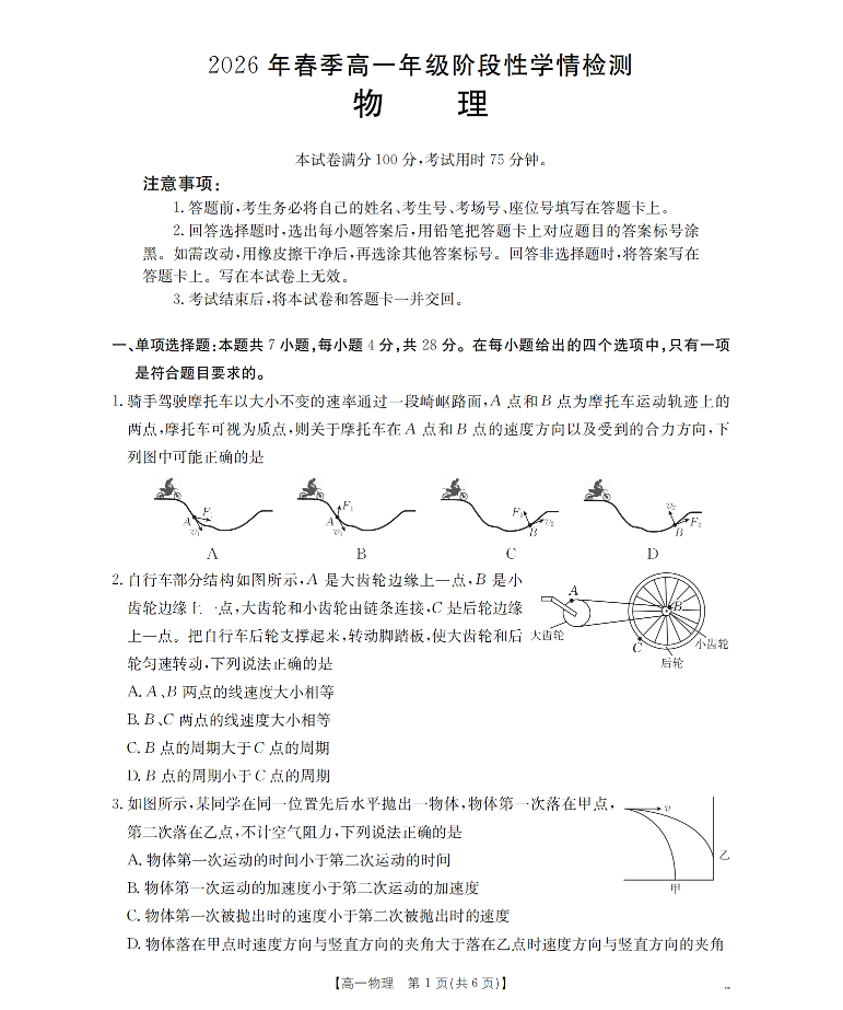 河南省南阳市南阳区域2026年春季高一年级阶段性学情检测 物理.pdf
