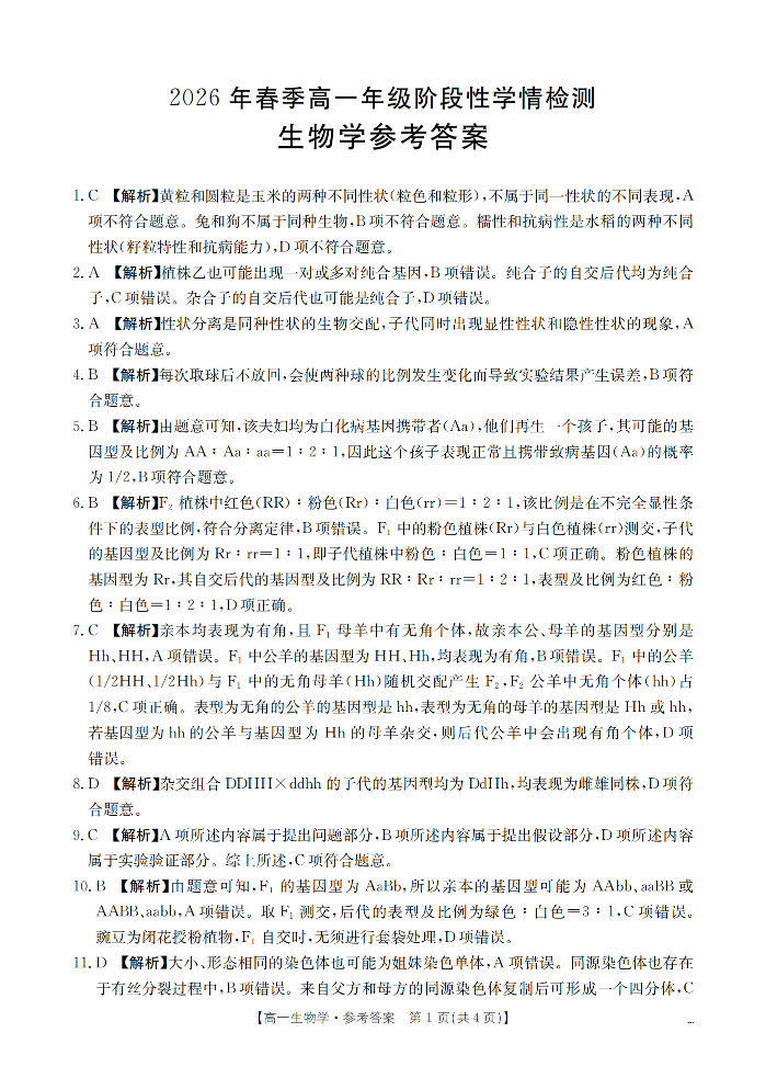 河南省南阳市南阳区域2026年春季高一年级阶段性学情检测 生物答案.pdf