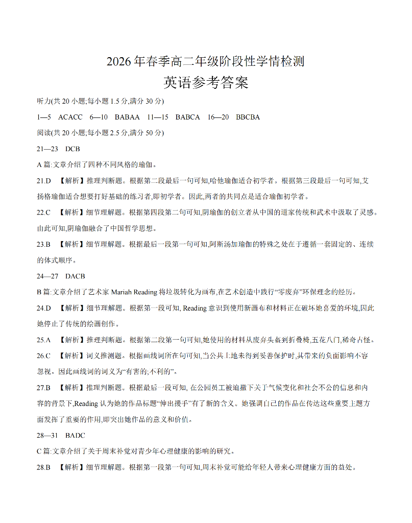 河南省南阳市南阳区域2026年春季高二年级阶段性学情检测 英语答案.pdf