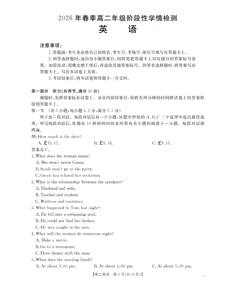 河南省南阳市南阳区域2026年春季高二年级阶段性学情检测 英语.pdf