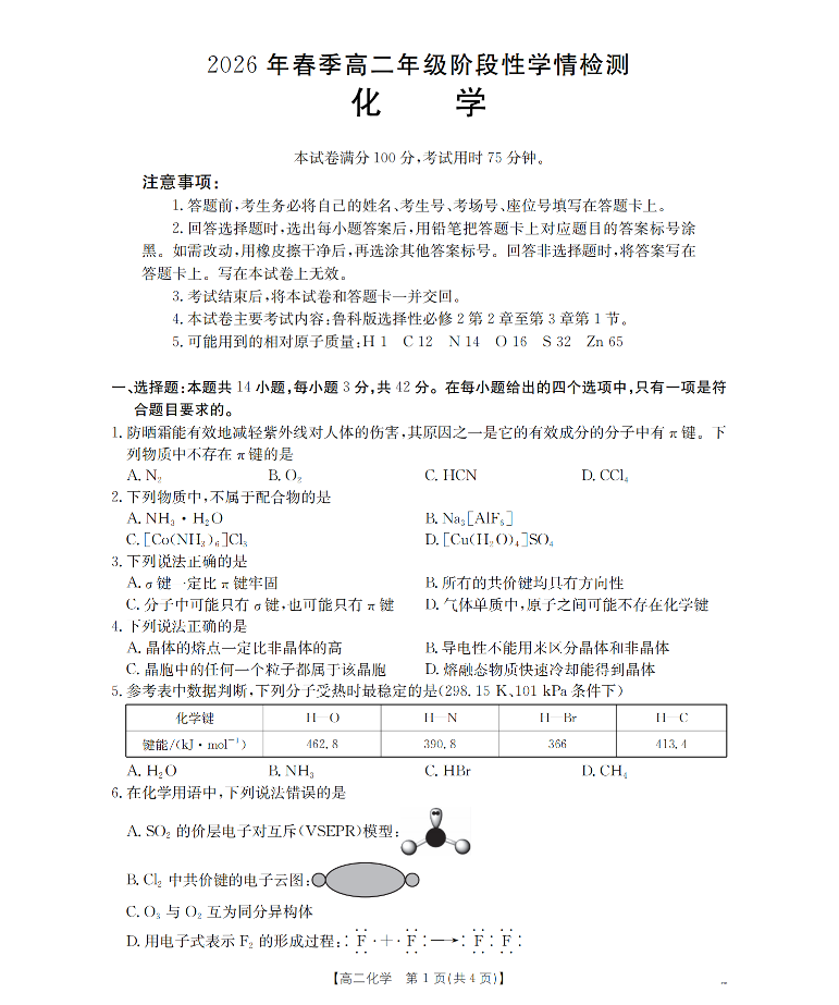 河南省南阳市南阳区域2026年春季高二年级阶段性学情检测 化学.pdf