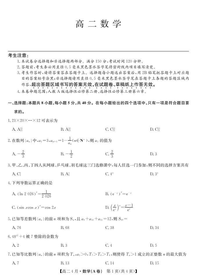 安徽省县中联盟2027届高二年级下学期4月联考 数学.pdf