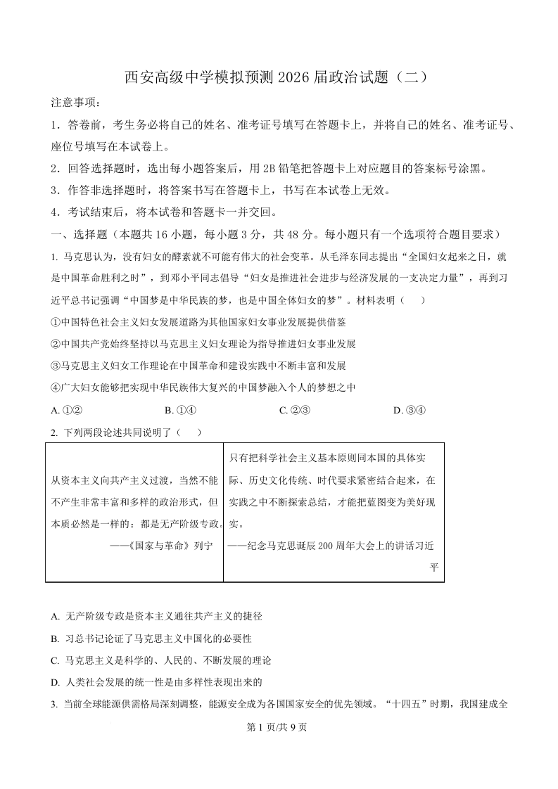 陕西省西安高级中学2026届高三下学期模拟预测(二)政治.docx