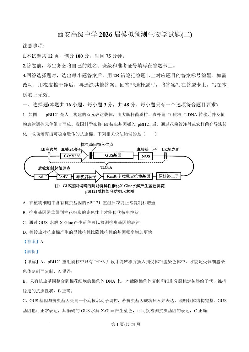 陕西省西安高级中学2026届高三下学期模拟预测(二)生物答案.docx