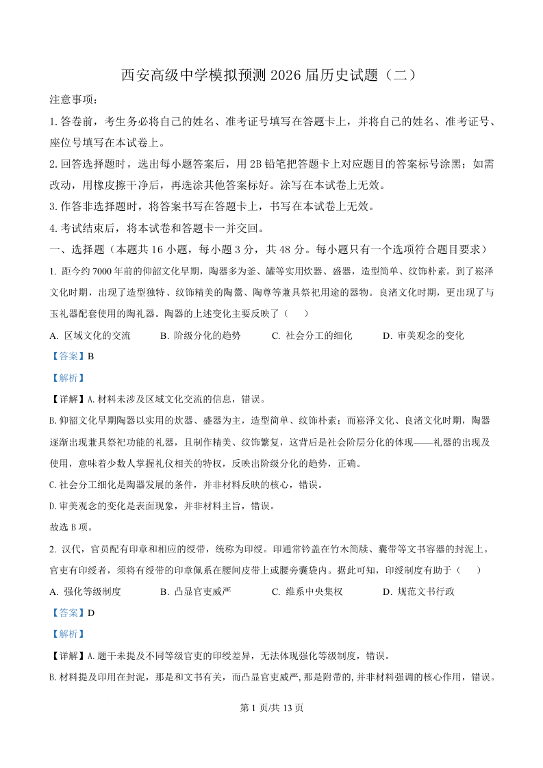 陕西省西安高级中学2026届高三下学期模拟预测(二)历史答案.docx