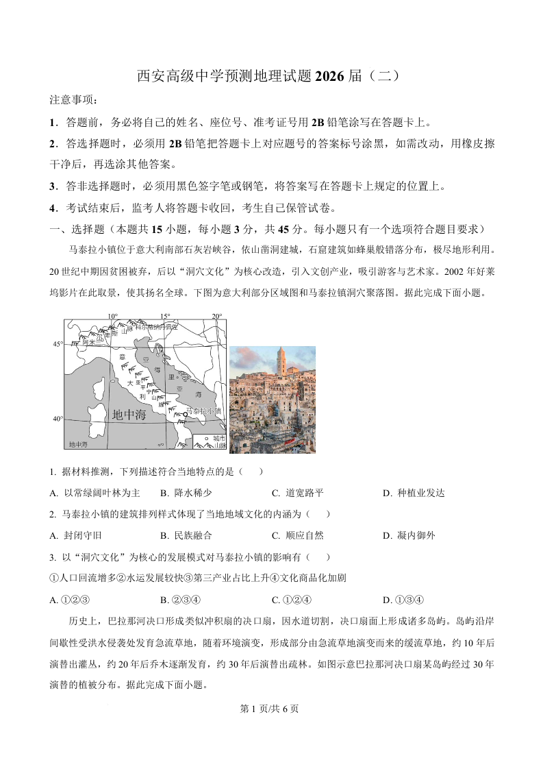 陕西省西安高级中学2026届高三下学期模拟预测(二)地理.docx