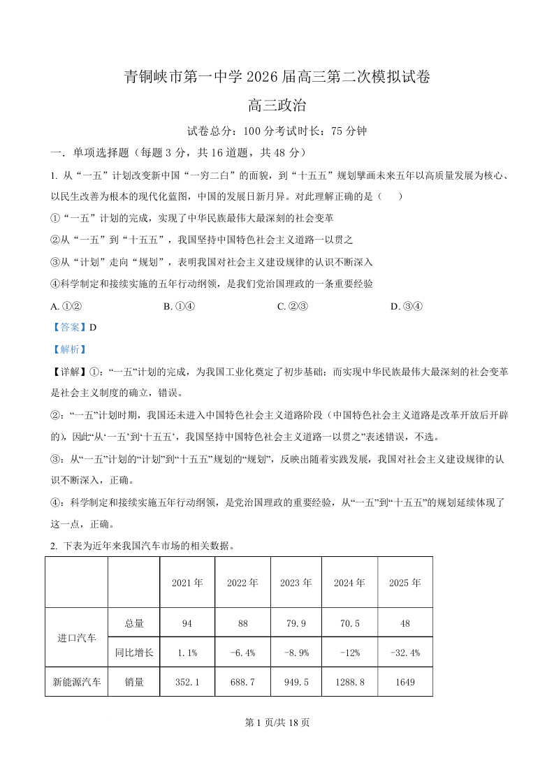 宁夏吴忠市青铜峡市第一中学2026届高三下学期第二次模拟考试 政治答案.docx