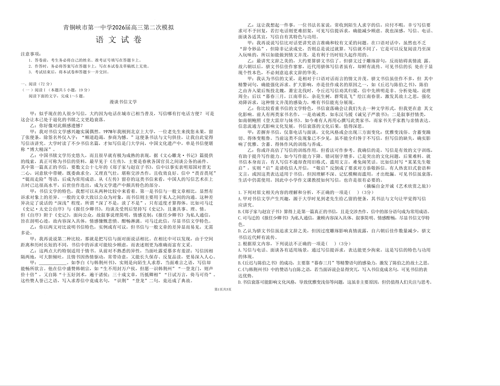宁夏吴忠市青铜峡市第一中学2026届高三下学期第二次模拟考试 语文.docx