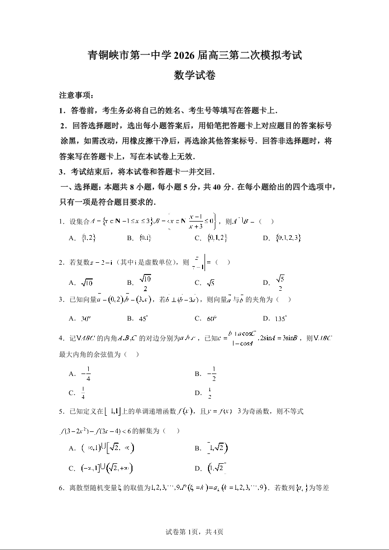 宁夏吴忠市青铜峡市第一中学2026届高三下学期第二次模拟考试 数学答案.docx