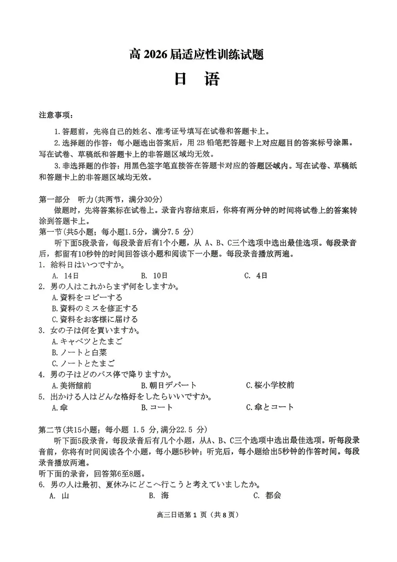内江市高2026届适应性训练试题 日语.pdf