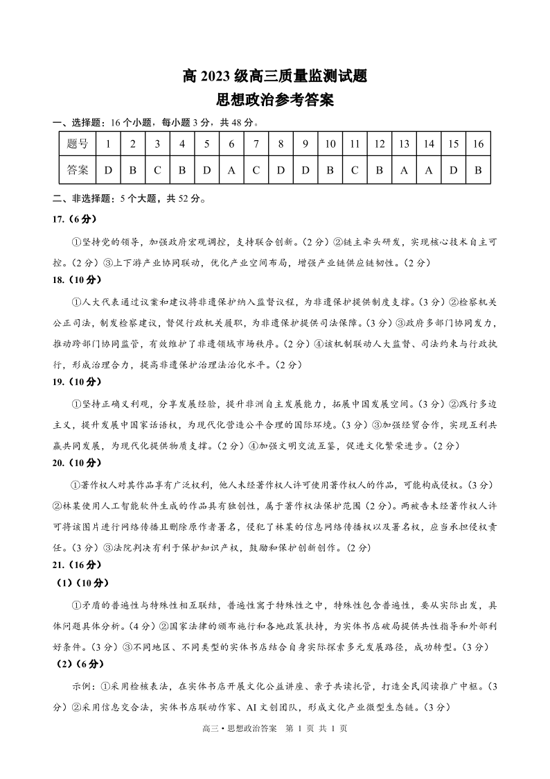 泸州市高2023级高三质量监测试题 政治答案.pdf