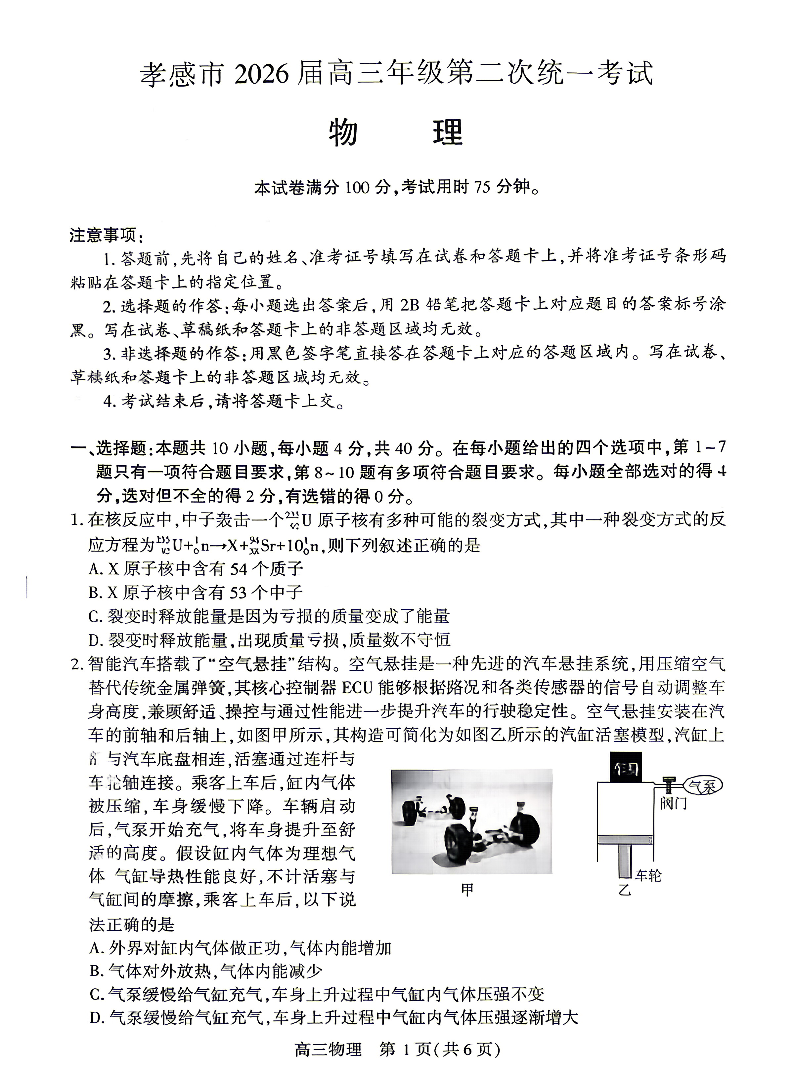 孝感市2026届高三年级第二次统一考试 物理.pdf