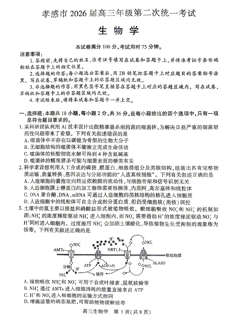 孝感市2026届高三年级第二次统一考试 生物.pdf
